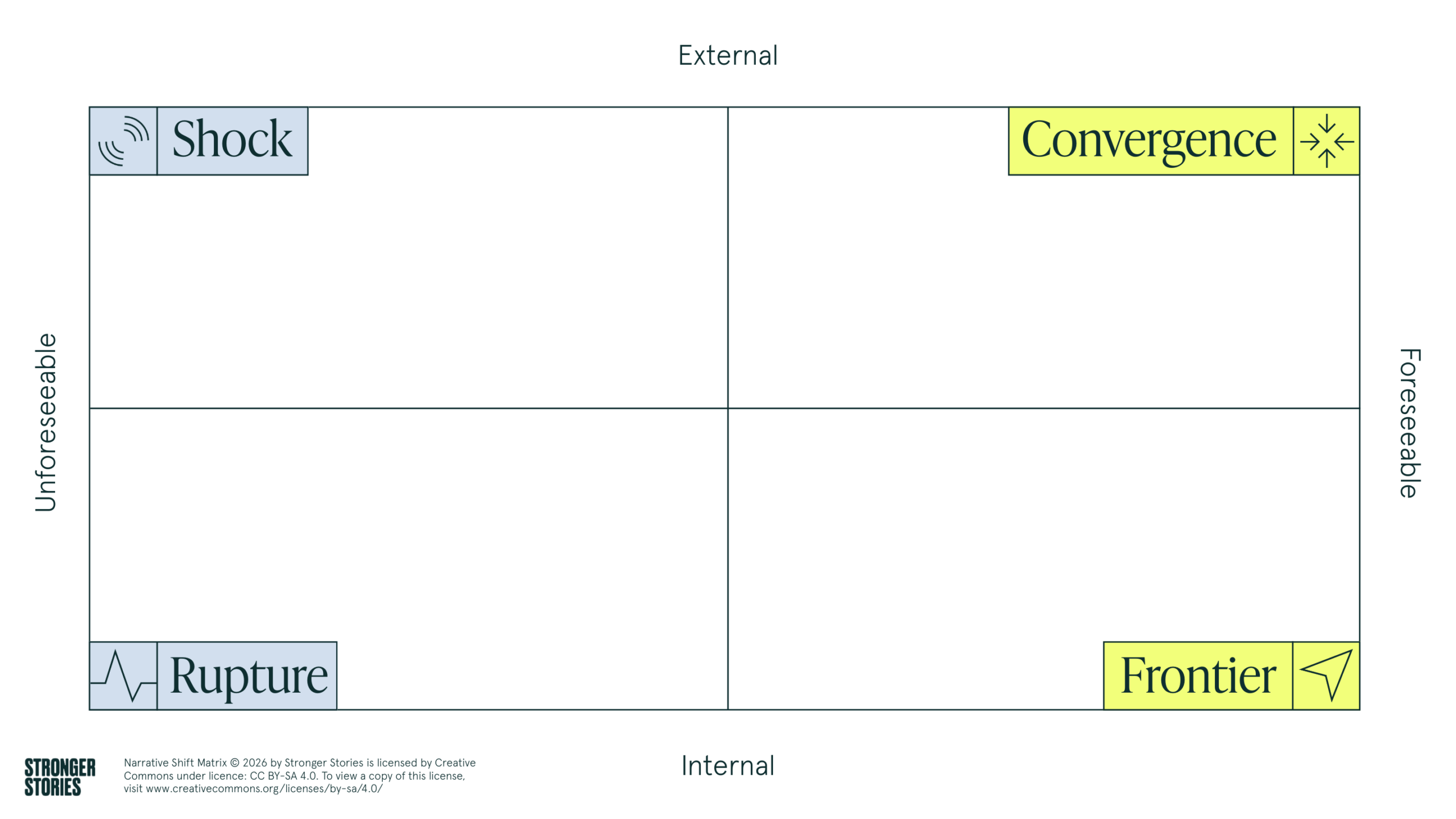 The Narrative Shift Matrix is a simple diagnostic tool designed to help leaders locate the moment of change they’re facing, understand its impact on belief and identity, and create the conditions for a better story to emerge.